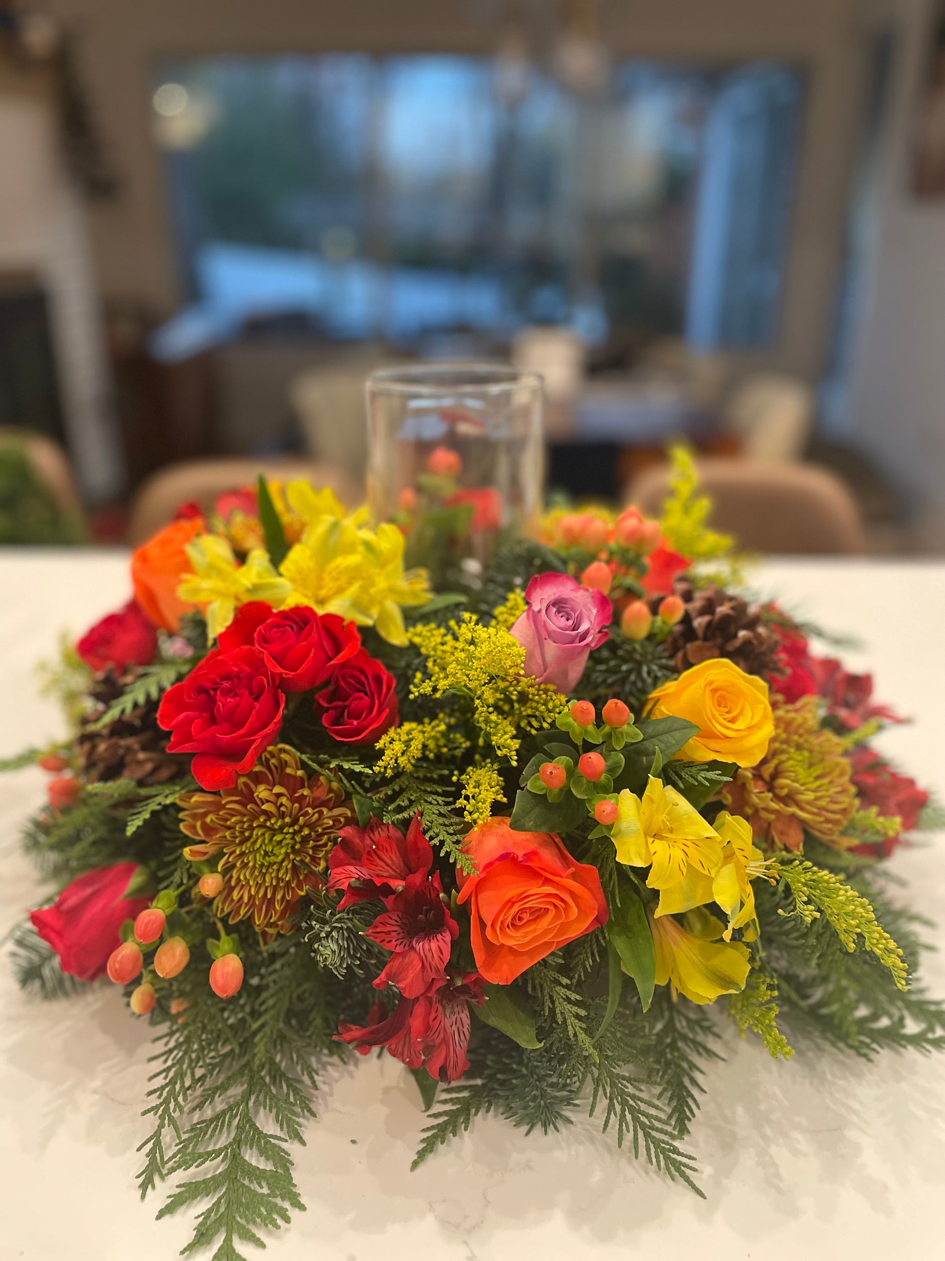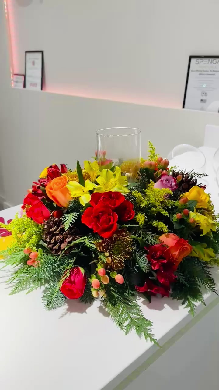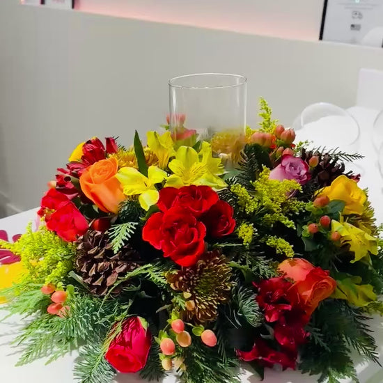 Brighten your home this season with our handcrafted Autumn Glow Candle Centerpiece. Made with premium fresh roses, alstroemeria, mums, snapdragons, hypericum berries, pinecones, and fragrant evergreens, this design surrounds a glass hurricane vase ideal for a pillar candle.