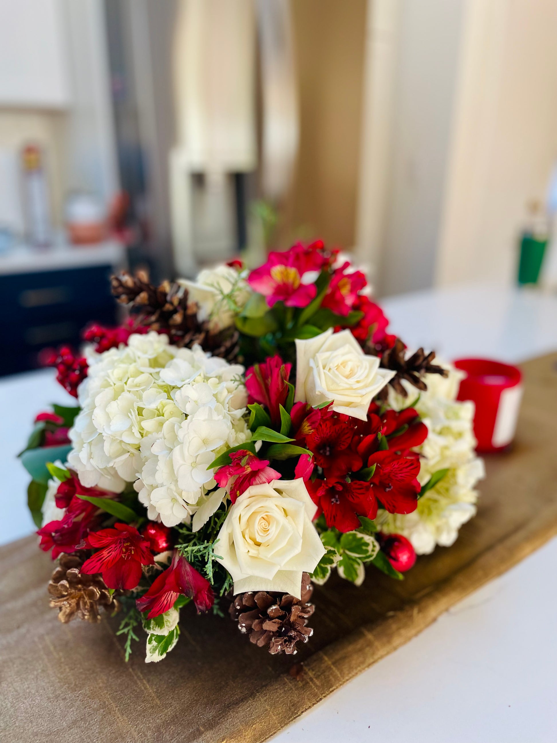 Holly berries, vibrant red alstroemerias, and snow-white roses blend harmoniously to create a dazzling floral recipe, perfect for making your Christmas celebration truly unforgettable.