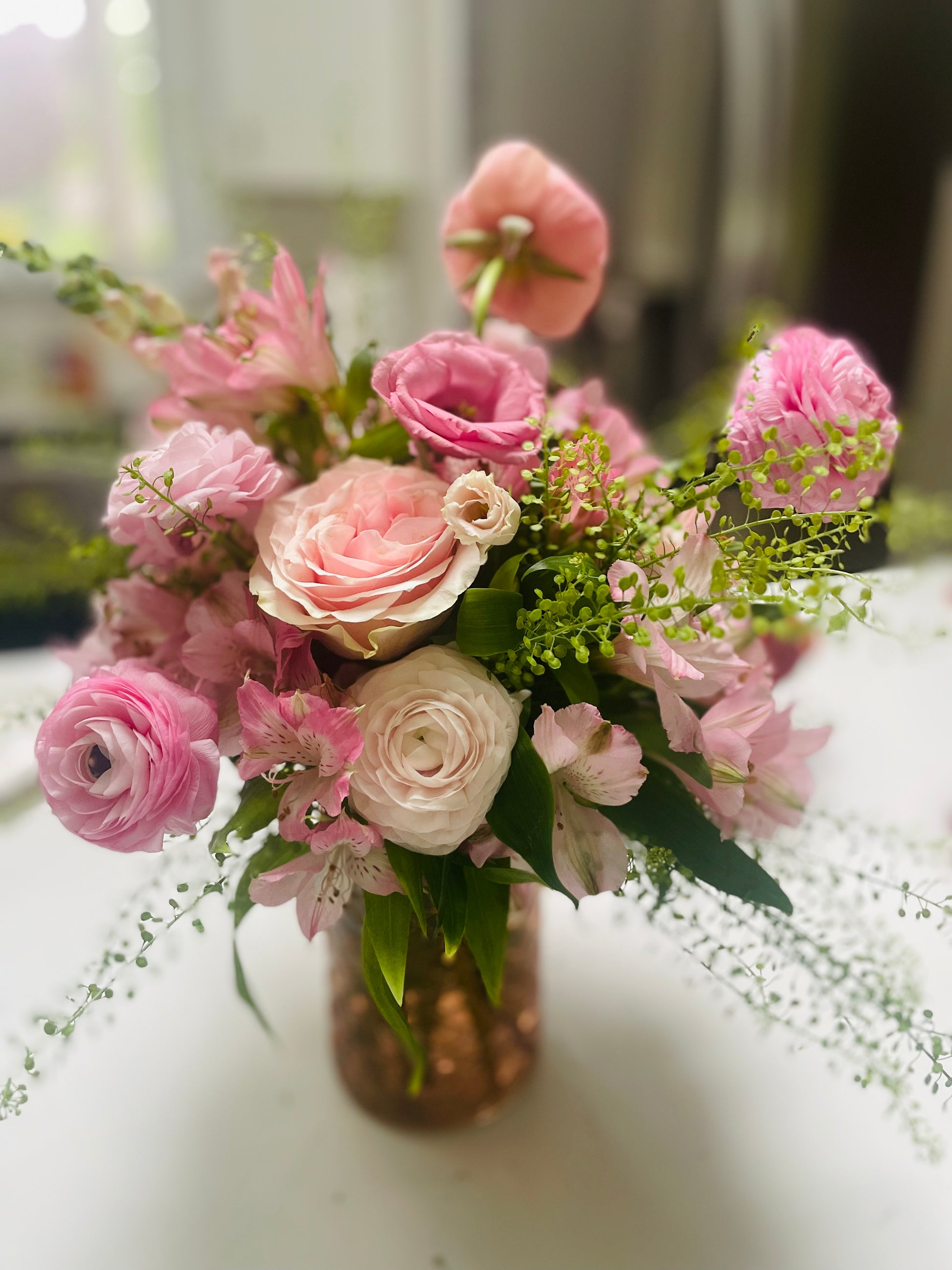 Blush-colored ranunculus and roses with sweet green hydrangeas are the perfect flowers to share with your love.